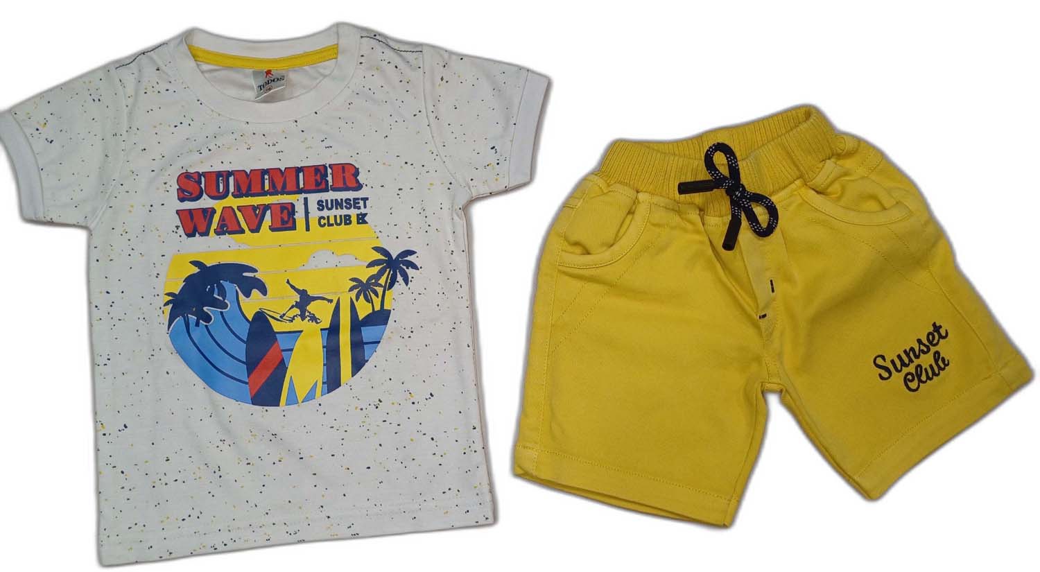 Boys Typography Printed Cotton T-shirt with Short - Whie & Yellow