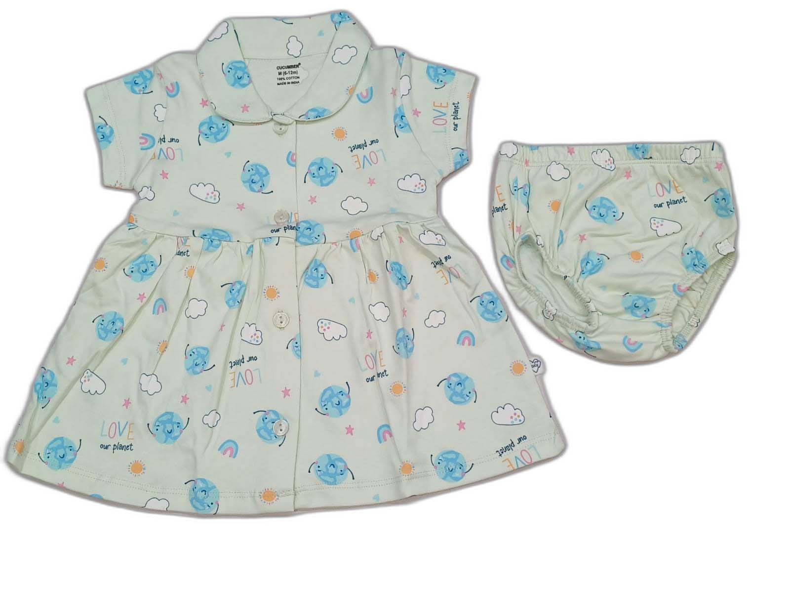 CUCUMBER Interlock Knit Half Sleeves Front Open Frock with panty - Green